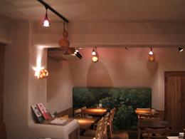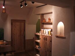 麻壁を使った内装以外にもランプや机など様々なところで麻にこだわったお店。
